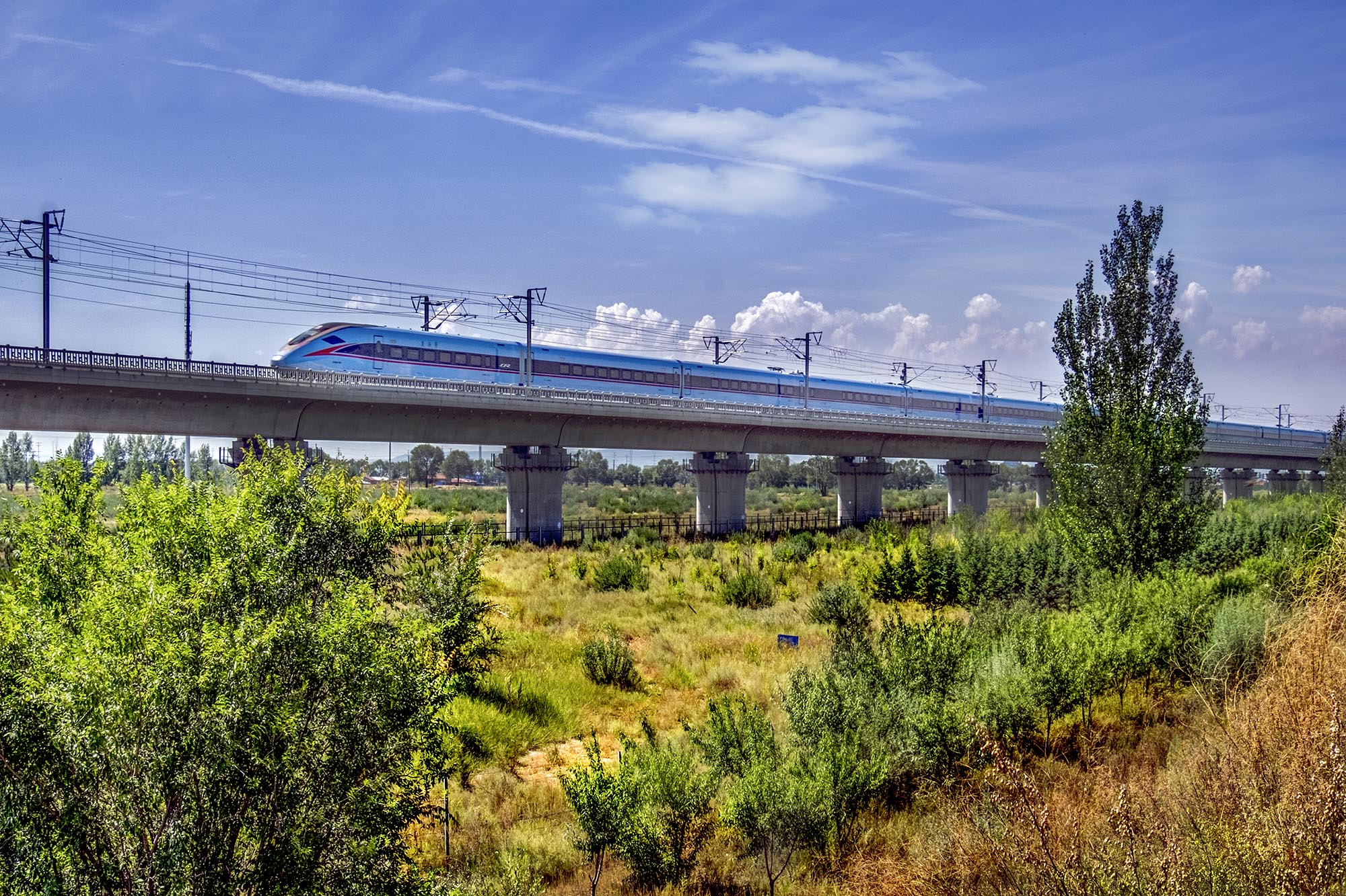 科技日?qǐng)?bào):一列動(dòng)車組列車行駛在山丹馬軍場(chǎng)境內(nèi)的蘭新高鐵上