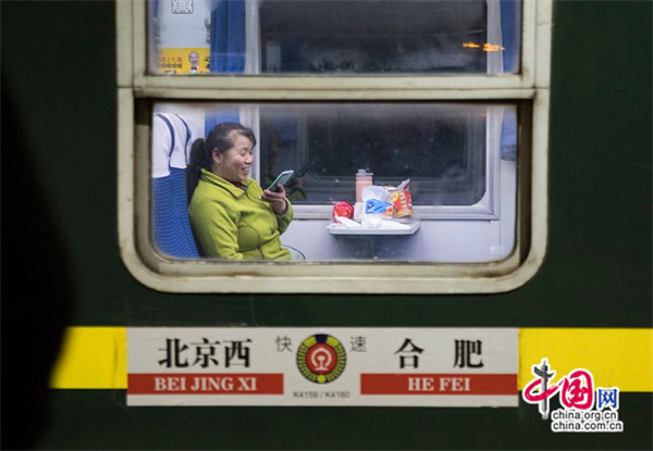 登上K4159次春運(yùn)首班列車的乘客第一時(shí)間向家人報(bào)平安。中國(guó)網(wǎng)記者 馬曠/攝