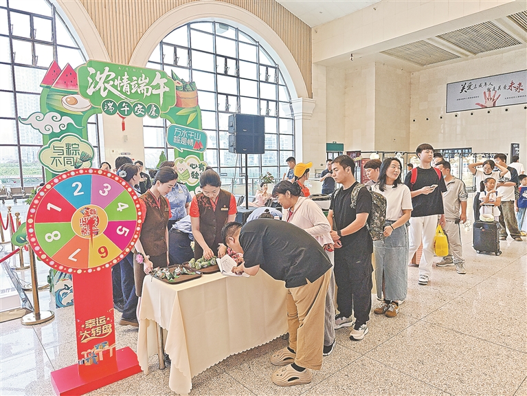 屈原故里,楚韻傳情。宜昌車務段在宜昌東站候車室開展文化互動活動?;顒釉诿烂畹姆沁z音樂《后皇嘉樹》中拉開序幕,通過展示荊楚特色的民族音樂快閃、《賽龍舟》《離騷》等經(jīng)典曲目表演,推動“屈原故里 非遺端午”文化傳播。車站工作人員向旅客發(fā)放艾草枝、五彩繩等紀念品,并邀請旅客體驗包粽子、縫制香囊、編織五彩繩等非遺手工?!暗谝淮卧诨疖囌靖惺艿竭@么濃郁的端午節(jié)日氣息,讓我們的旅途備感愉悅?!眮碜詿o錫的旅客姚先生受現(xiàn)場氛圍感染,主動上臺用電吹管演奏歌曲《攙扶》,贏得熱烈掌聲。